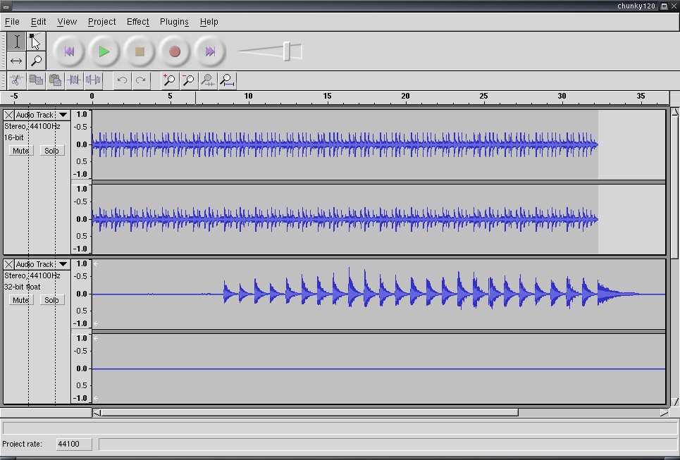 Audacity e' un editor di suoni multipiattaforma in rapida evoluzione. La versione per GNU/Linux contiene un buon set di strumenti per l'editing, il supporto per i plugin LADSPA, e la capacita' di effettuare registrazioni multitraccia. La sua interfaccia utente e' ben disegnata, ordinata e facile da navigare. I formati di file supportati comprendono WAV, AIFF, AU, SND, ed MP3; Audacity e' inoltre capace di esportare in formato OGG. Le funzioni standard di taglia/copia/incolla sono presenti cosi' come le utilissime annulla/ripeti. Procediamo quindi con un esempio per vedere cosa possiamo fare e con quanta facilita' possiamo farlo grazie ad Audacity.